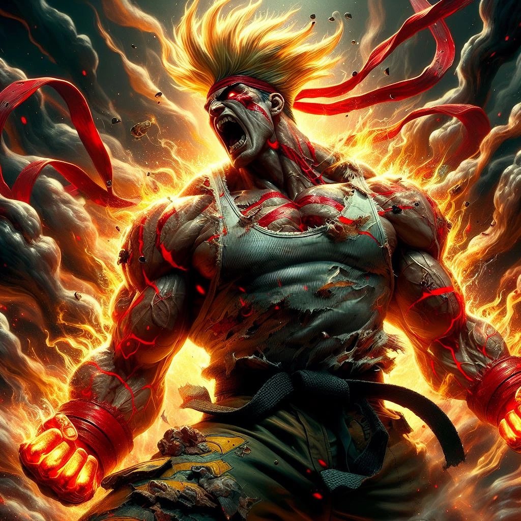 Street fighter: Guile fighting at war, injured and dirty, ripped clothes, military clothers, tank top, raging, character design, body is adorned with glowing red runes, yellow and red aura around him, body dynamic epic action pose, detailed anime style, fw murano style, full body GALAXY armour, plumes of jet black plumes smokes forming a strong wind, In the style of Prokoko, with a focus on bold, expressive brushstrokes and vivid colors, The modifier is CarnageStyle, the color is blood_red, and the intensity is 1. 6, the lighting is cinematic, the angle is dynamic, the details are extreme \n\n