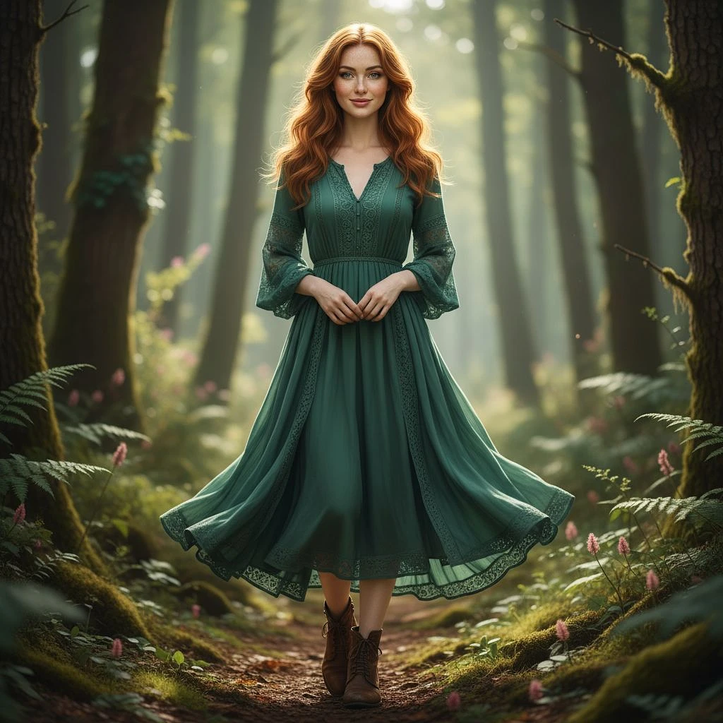 Full Body View, Full Body Image, 29-year-old woman, ginger hair in soft waves, porcelain-white skin, light freckles around nose, striking green eyes, heart-shaped face, high cheekbones, gentle smile, natural beauty, photorealistic, cinematic lighting, ultra-detailed, DSLR depth of field, professional FULL BODY , cinematic framing, 16:9 aspect ratio, wide shot, ultra-realistic photography