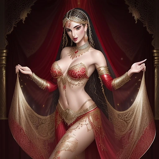 I would like a high-resolution portrait of a super model beautiful 25 year old belly dancer wearing exquisite flowing red silk belly dancer attire, elaborately adorned with intricate gold and silver embroidery that shimmers like moonlight, The dancing silks are predominantly red with intricate gold and silver detailing featuring ornate patterns and designs, The woman is poised confidently, her hands are reaching upwards to the sky as arches achingly backwards, Her facial expression is sultry as if playful and toying, She has radiant alabaster colored skin akin the opulence of a pearl, long dark raven tresses floating about her like tendrils, piercing dark green eyes, The background is an opulent setting that surrounds her with warmth and elegance, Torch flames flicker casting a golden glow on ornate tapestries depicting ancient tales, A majestic throne-like chair stands sentinel in the background upholstered with plush, jewel-toned cushions, The atmosphere exudes refinement loyalty and serenity mirroring the dancer's tranquil demeanor, Soft realistic textures and warm tones bring depth and intimacy to the scene inviting the viewer to step into this enchanting world, The overall composition is centered, with the emphasizing the dancers presence, her beauty and the detailed craftsmanship of the embroidery of her dancing silks (detailed body:1, 5) (high detailed skin:1. 2) , (best quality:1. 4) , (blemishes:1) , (highly detailed clothes:1) (highly detailed face:1) , (((real hair) )) (masterpiece) (best quality) (detailed) (8k) (HDR) (cinematic lighting) (sharp focus) (intricate) , (8k, RAW photo, best quality, masterpiece:1. 2) , (realistic, photo-realistic:1. 37) , ultra high res, (focus face:1. 6) , (portrait face:1. 3) , (high contrast:1. 1) , (intense:1. 1) , (detailed:1. 1) , (highest quality, (analog:1. 2) , (high sharpness) , real shadow, photographed by Canon EOS R6, 135mm, 1/1250s, f/2. 8, ISO