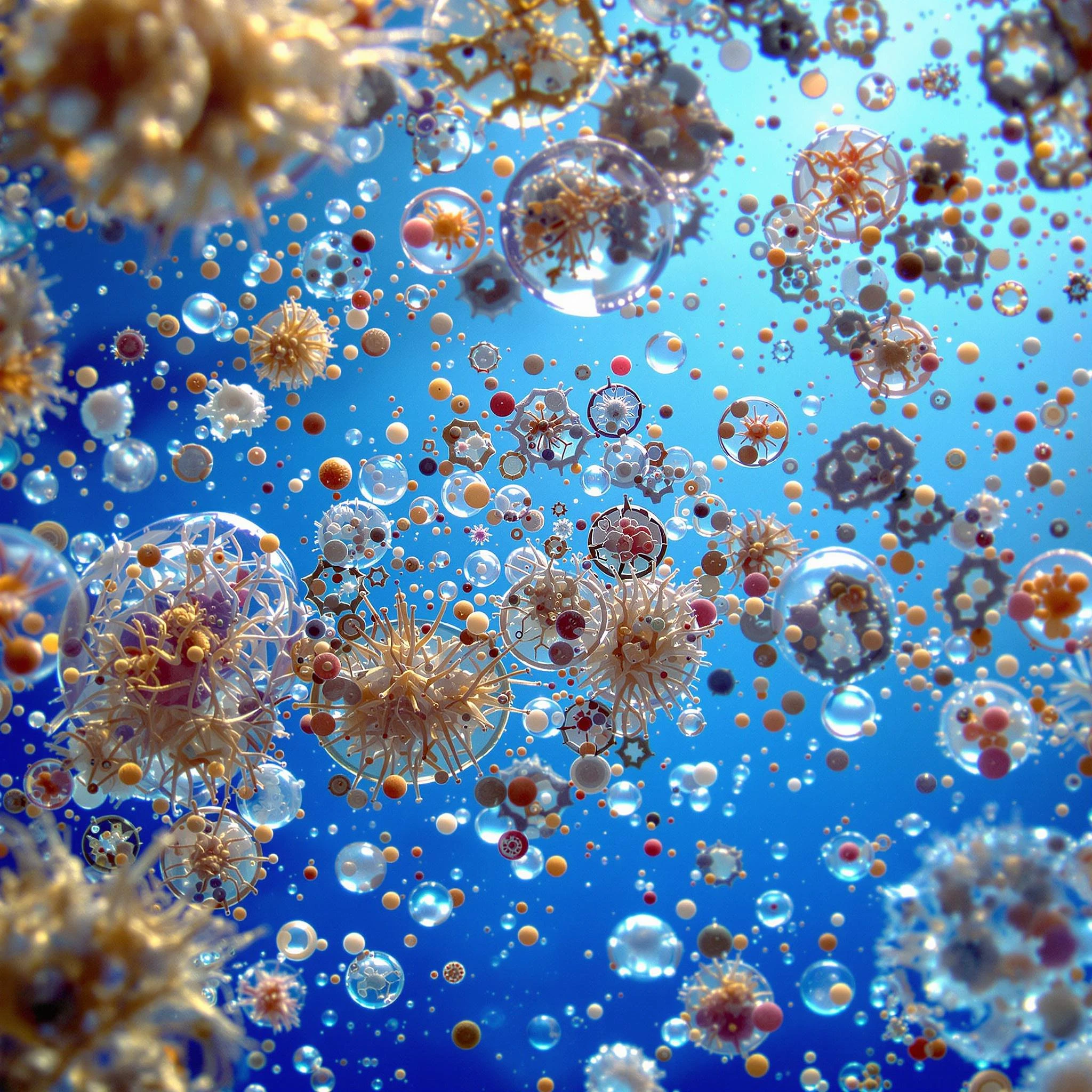 Create a highly detailed microscopic image of seawater, capturing the tiny organisms, plankton, and particles suspended in the water. The image should highlight the diversity of shapes and colors, with translucent bodies, intricate patterns, and a natural, organic appearance. The background should be a gradient of blue, giving a sense of depth and fluidity, showcasing the wonders of the microscopic world within seawater.