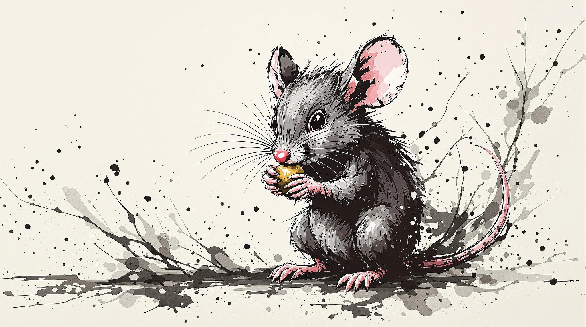 cute Mouse with straight face grabing something, detailed, ink style, Ink splash art on the background, ink style, Ink wraps around the body, and the ink obscures the subject, exquisite