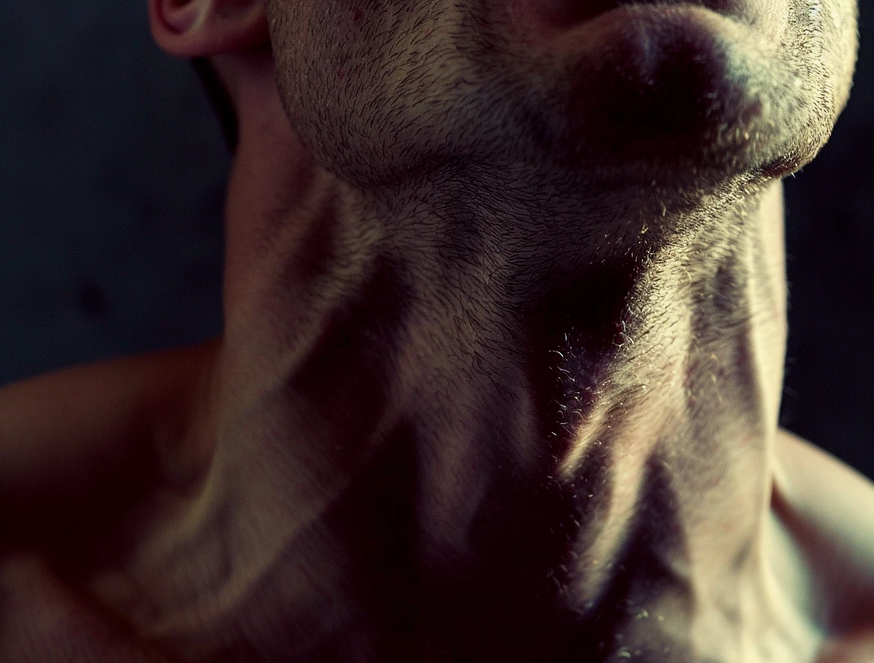 Close up of an attractive muscular man's mouth, in the background is his torso and chest, home video style photo from the early 2020s, grainy film quality in the style of an early digital camera. --ar 93:71 --v 6. 0