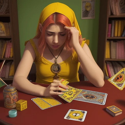 una foto realista, de una chica de 20 años, usando un hottie amarillo, leyendo las cartas del tarot, fortune teller, pelo recojido.
