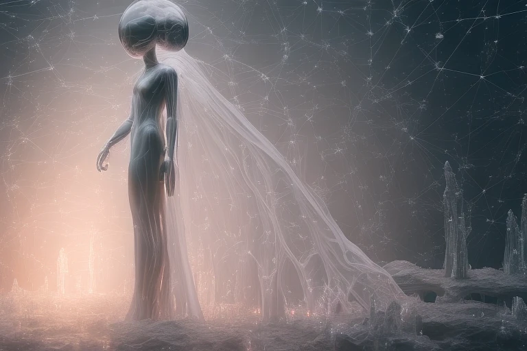 mdjrny -v4 style, a sculpture of transparent alabaster of a veiled figure with barely perceptive outline, tall, elongated, arms outstretched to the sky at the end of the world, its sorrow hidden, night time volumetric pink glowing lighting, fairy lights moonlight, ray tracing, transparent alabaster, loneliness, emptiness, grief, 8k, octane rendering, 3d engine