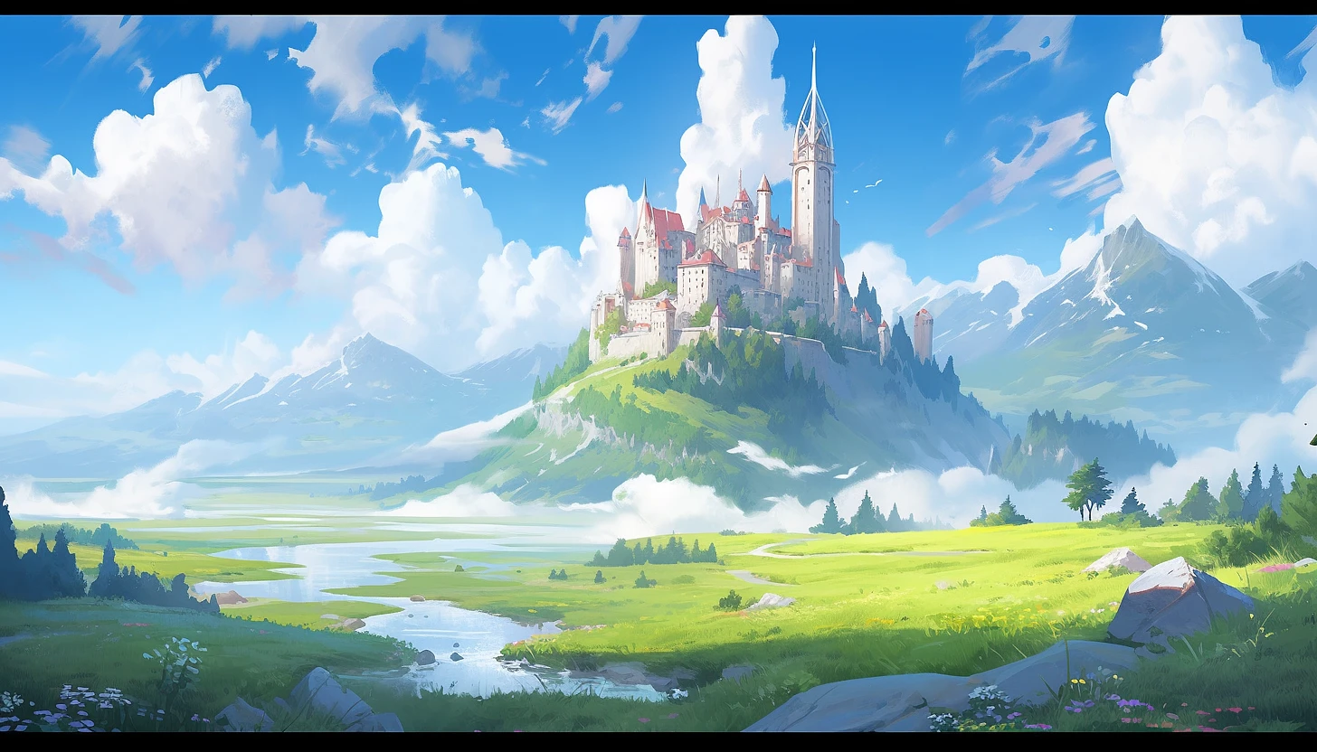 in the style of WLOP, a valley, forests, mountains, castle ruins, medieval, fantasy, masterpiece, concept art, anime, 2D, 3D, painting, mangacore, cartooncore, game art, semi realistic, photo realistic, hyper realistic, hyper detailed, --ar 7:4 --niji 5