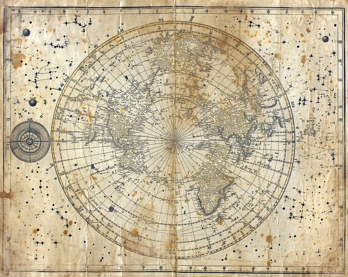 An old weathered map marked with constellations, mathematical lines, and symbols.