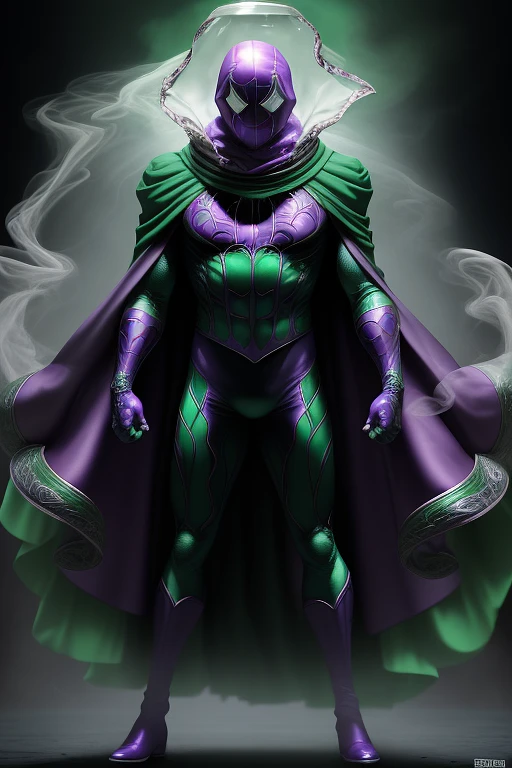 mysterio, a formidable villain, real spiderman costume, full body shot, wears a deep purple and green costume with intricate patterns resembling flowing smoke, high-collar cape billows dramatically, ((distinctive helmet with a rounded fishbowl-like dome) ), conceals his face while housing swirling mist effects, enhance his illusionary powers