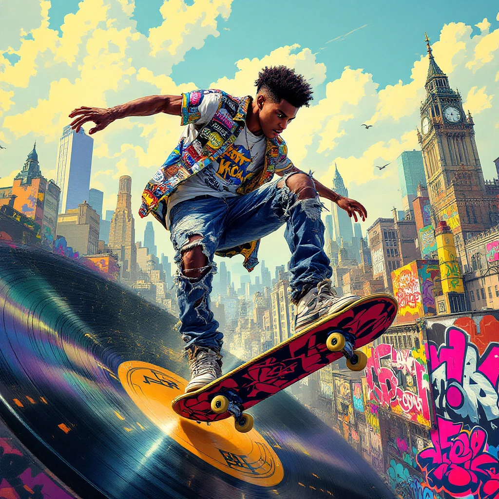 10. A dynamic, full-body action shot of a american black boy short hair skateboarding on a giant, floating vinyl record above a vibrant, graffiti-covered cityscape. he wears a patchwork of vintage band t-shirts and torn denim, short hair and her posture exudes confidence and rebellious energy. The style merges the urban energy of street art with the dynamic compositions of comic books and the retro vibe of vintage music posters.