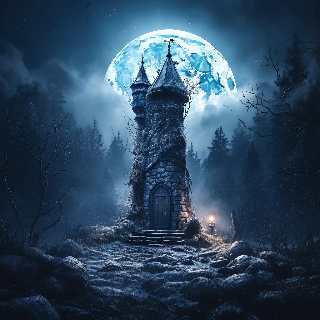 haunting stone tower surrounded by a dense taiga forest, dark door, blue moon in the sky, night shot, blue mushrooms on the ground, winter season, the dark crystal movie style, cinematographic lighting, masterpiece, high detail, 4k, photo, digital art, fantasy --v 5. 2