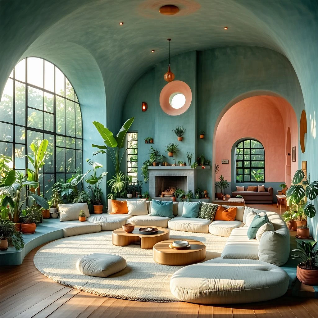 High resolution photography interior design, dreamy sunken living room conversation pit, wooden floor, small windows opening onto the garden, bauhaus furniture and decoration, high ceiling, beige blue salmon pastel palette, interior design magazine, cozy atmosphere; 8k, intricate detail, photorealistic, realistic light, wide angle, kinkfolk photography, A+D architecture