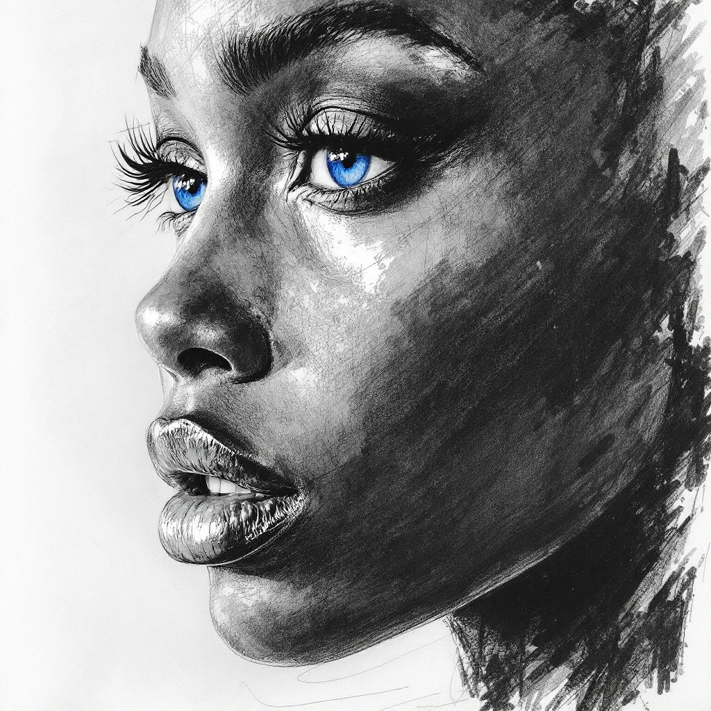 graphite pencil drawing, lovely black woman's face, beauty, side view, by Odilon Redon --ar 1:2 --stylize 750 --v 6. 1 Highly detailed, beautiful blue eyes