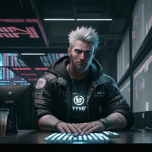 Hyper realistic eye level exterior photo of The Trading room is digital art dim, with only the white light from the screens illuminating the room. The alpha dog Trader is sitting in front of a wall of large trading screens, typing code on a keyboard. He wears cyberpunk crypto coin implants and drinks extra large coffee. He loves coffee. The programmer is surrounded by chaos, hyper realism, high detail, octane render, celestial arena,  fire storm,  ice storm,  body crackling with lightning,  lightning halo,  tilted halo,  crackling lightning,  lightning charged atmosphere,  beautifully detailed fur,  brilliant detailed eyes,  beautifully detailed face, but he doesn't seem to notice or care. Digital Art. 3D Render 8k