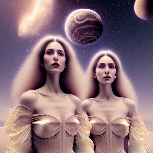 on the right two women figures dressed in rich velvet and cream lace luxurious flowing renaissance gowns on an alien world watching two overlapping huge moons right and open night starry sky, volumetric light, fine dusty iridescent gradient light, high detailing, high angle view, wide-angle, grand masters' style, 8k, octane render, oil painting