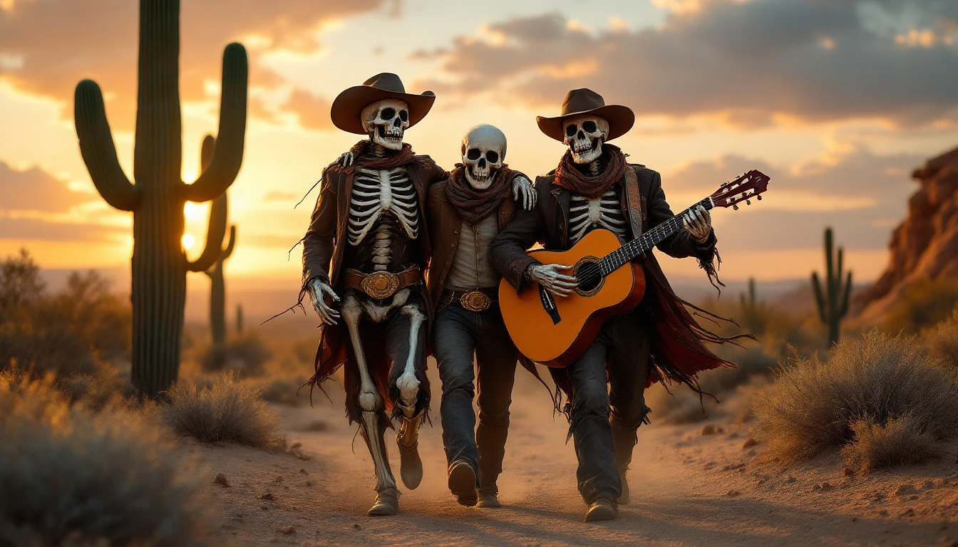 Hola, quiero la siguiente imagen: Un hombre junto a dos calaveras caminando de espaldas en el desierto. La calavera de la derecha lleva una guitarra y los tres se agarran por los hombros. Quiero que la escena sea al atardecer y que sea jovial, que parezca que, mientras andan, están bailando. Estaría bien, ya que están en el desierto y al atardecer, que aparecieran cactus. Quiero que el estilo sea tipo western. Quiero que se vean caminando de espaldas y quiero que el del medio sea un hombre y no un esqueleto. Quiero que se vean desde atrás, no de frente. Desde atrás. Es decir, que se vean las espaldas de los dos esqueletos y del hombre y no las caras. Quiero que las dos calaveras lleven poncho