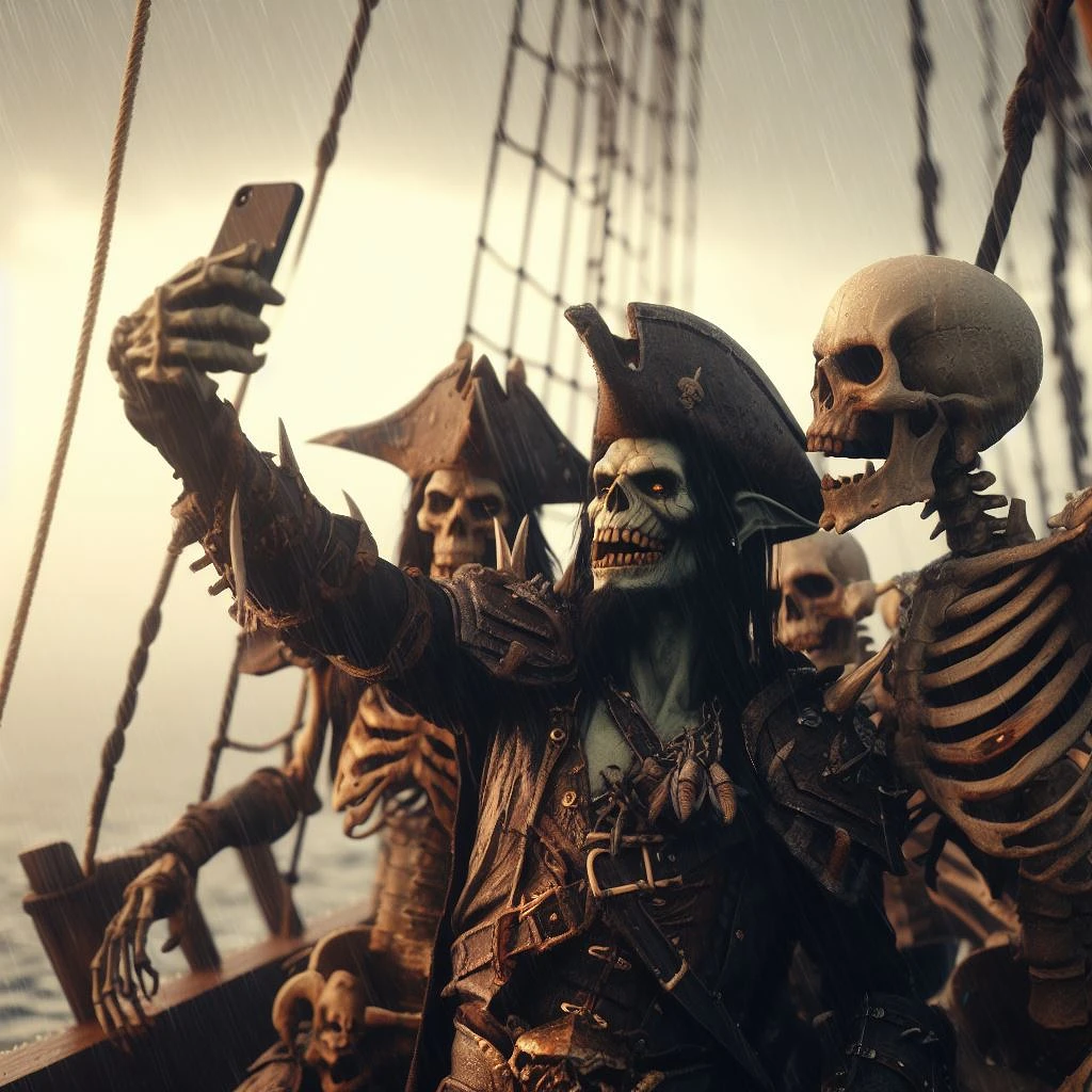 1800 pirates on a pirate ship taking a selfie:award winning photo of a skeleton pirates on a pirate ship, rainy storm, golden hour:0. 25