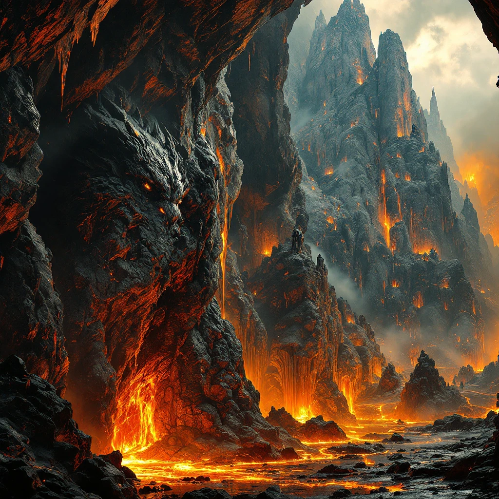 an insanely detailed dragon’s cavern. A cavern where a massive ferocious dragon lives. Dark colors, gothic, high contrast, enchsnyimg aura, unmixed and untouched precious metals adorn the mountain that. makes up the cavern walls. Huge statues carved into the mountainside what was once tribute to Norse gods of old. Liquid magma spills over the edge on some sides, dripping down into the fiery depths of the caverns below. However not effecting the dragons part of the caverns, which seems to be packed full of the dragons spoils. Gold, rare crystals, jewelry, and fancy weapons. High-red 8K HD. Photorealism. Detailed. High Quality. High Contrast.