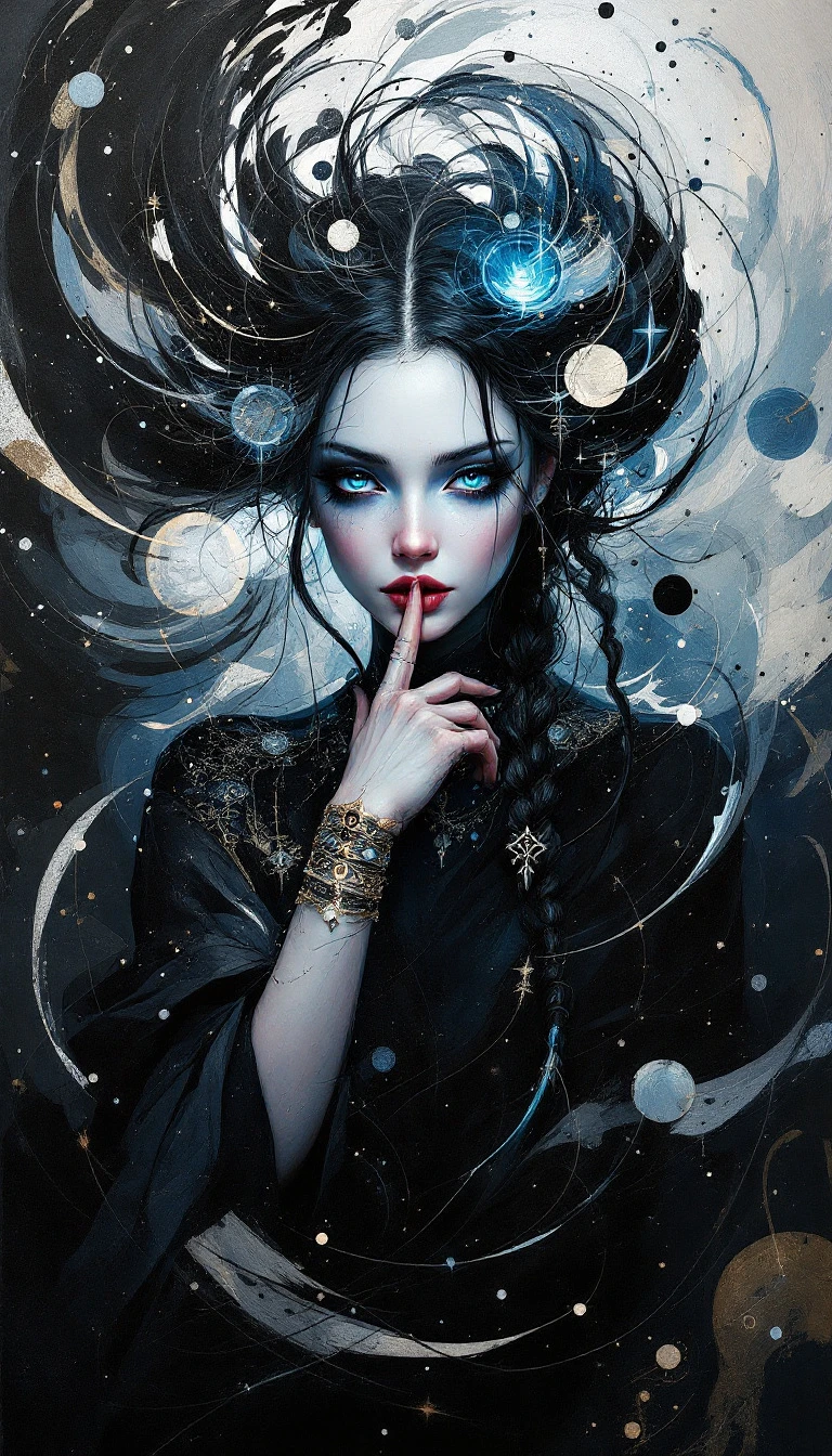 "Onyx Whisperer in a Shifting Void": A mesmerizing abstract painting showcases a whisperer, with a blend of mystery and a subtle allure. She is a skilled communicator, shown within a void filled with swirling patterns of light and shadow, with pale features, black hair styled into delicate braids, and a dark, flowing outfit. Ornate jewelry and symbolic patterns adorn her wrists and hands. The artwork masterfully blends modern abstract concepts with a figure representation, with an ethereal array of colors including blacks, grays, and silvers. Her piercing, blue eyes, the composition's focal point, convey both secrets and an air of captivating mystique. After a night of sharing secrets, the whisperer embodies both intrigue and a quiet power. The layered hues and delicate brushstrokes invite the viewer to explore the hidden narratives within this vibrant work, presented as a painting.