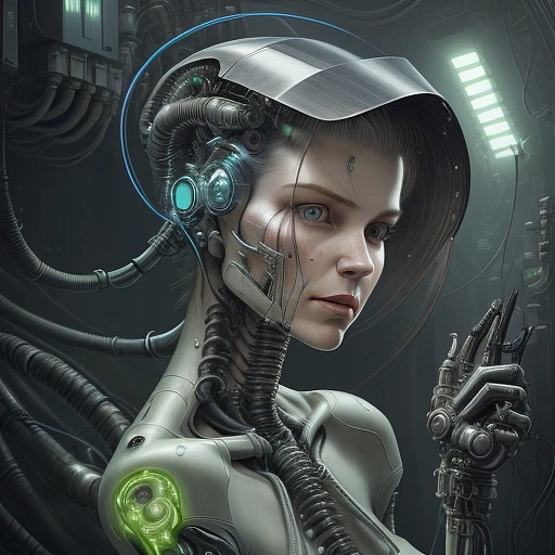 A woman is connected to a mechanical machine. she is connected to it with cables and wires. she is a cyborg. very detailed inplants are in her body and face. H. R. Giger, Jean Ansell, Justin Gerard