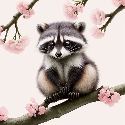featuring a cute baby raccoon, perched on a tree branch. The raccoon's adorable expression is enhanced by its large eyes and playful demeanor. The tree is surrounded by pastel pink flowers, adding a vibrant touch to the scene. The pure white background emphasizes the raccoon's cuteness and the delicate pastel hues. The artwork exudes a cinematic, poster-worthy, and fashionable appeal, perfect for illustration purposes. , illustration, vibrant, anime, cinematic, fashion, poster