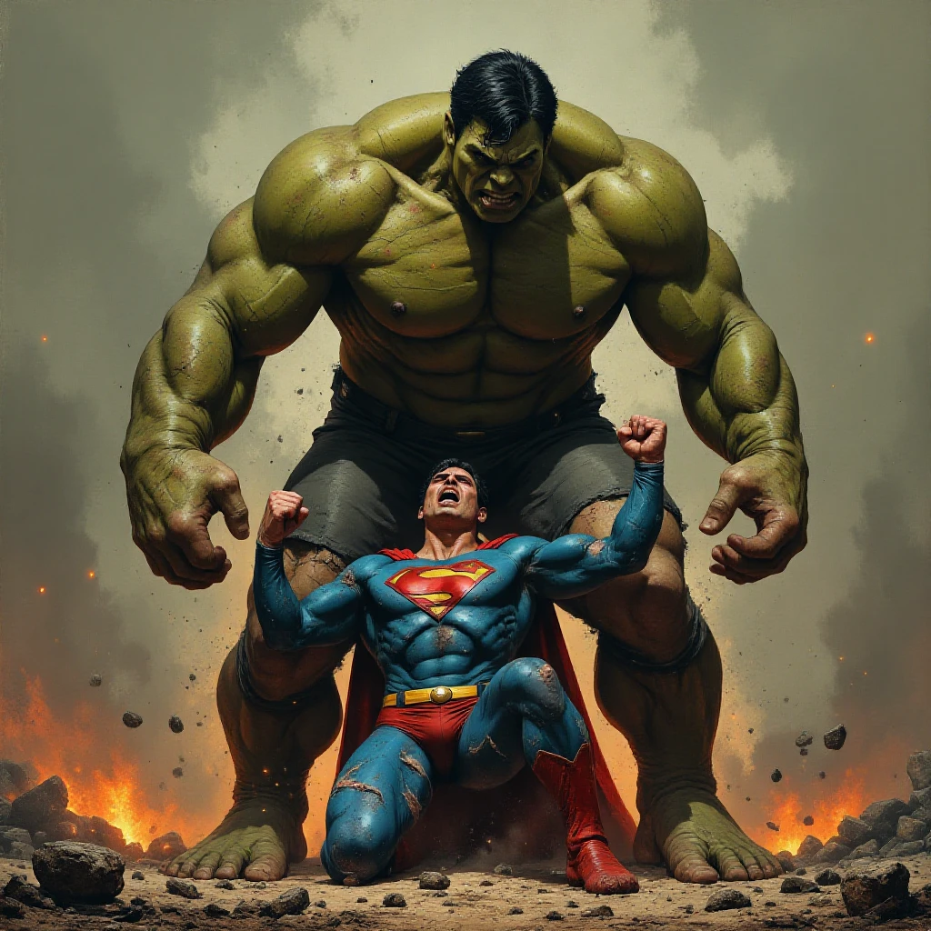 ((gritty, hyperrealistic painting:1.5) ), ((Hulk and Superman locked in a brutal power struggle:1.5) ), both hands clasped, fingers interlocked in a violent test of strength, muscles straining, tendons stretched to the limit. Superman, bruised, grounded, is down on one knee, his body twisting with resistance, arms trembling as he holds back the massive force bearing down on him. His blue suit is torn, his face bloodied, hair matted with sweat and soot, but his gaze is clear and defiant—no glowing eyes, only human resolve. The Hulk towers over him, full height—3 meters tall, 500 kilograms of brute muscle, drenched in sweat, skin streaked with grime and ash. His monstrous body looms with dominance, feet planted wide, both arms pressing down, veins bulging, face twisted in a roar of exertion. His skin cracks around his fists from the sheer pressure, saliva flying from his mouth as he snarls through clenched teeth. The ground beneath Superman’s knee is shattered, pressed inward by the weight. Shockwaves ripple through the dust, small stones hover in midair. The scene is dense with smoke, ash, and heat distortion, the ambient firelight casting flickering shadows over their bodies. Style: painted like an epic oil tableau—Caravaggio-like lighting, Repin’s anatomical drama, Beksiński’s apocalyptic ambiance. Every detail captured: grit on skin, blood at the lip, wrinkles in fabric, cracked stone, drifting embers, clenched fingers locked in struggle. Lighting: heavy chiaroscuro—low directional light from fires around them, long shadows falling across Superman’s face, rim lighting highlighting Hulk’s upper body, emphasizing the scale difference without diminishing the tension. Camera angle: low and close, from Superman’s left side, showing his knee pressed into shattered ground, arms lifted to hold off Hulk’s crushing weight. Hulk fills the vertical space, Superman dominates the emotional weight—a visual of pressure and refusal to yield. Art direction for Flux: – Hulk is 3m tall, 500kg, physically overwhelming, rendered with full weight and scale – Superman is human-scale, on one knee, but braced and locked in—the underdog with unbreakable resolve – Style: dark painterly realism, anatomical accuracy, no stylization, no superpowers shown – Textures: bruised flesh, torn cloth, cracked stone, sweat, grit, tension in the hands and faces – Environment: scorched battlefield, ambient smoke, sparks, fractured terrain, faint firelight – Theme: mythic struggle, physical scale vs inner will—no victor yet, only raw contest