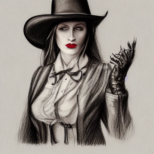 a drawing of a pale female with straight ginger hair hazel eyes, a serious expression, and red lipstick in the style of wildwest gothic, western-style portraits, sharp focus, moody lighting, realistic figures, wearing a black cowboy hat