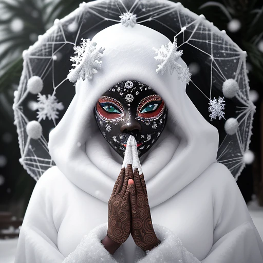 DamShelma's art capturing an awe-inspiring lady donning traditional African voodoo mask, encircled by a mystical snowfall in wintertime, snowy backdrop, voodoo mask intricate patterns, cold climate, heavy snowflakes drifting down, masked face mystery and enchantment, magic realism style, snowy landscape, winter chill, ethereal beauty, contrasting elements- tropical mask, frosty environment, enhanced detail, vivid colors, eerie allure, digitally rendered, aesthetics of intrigue