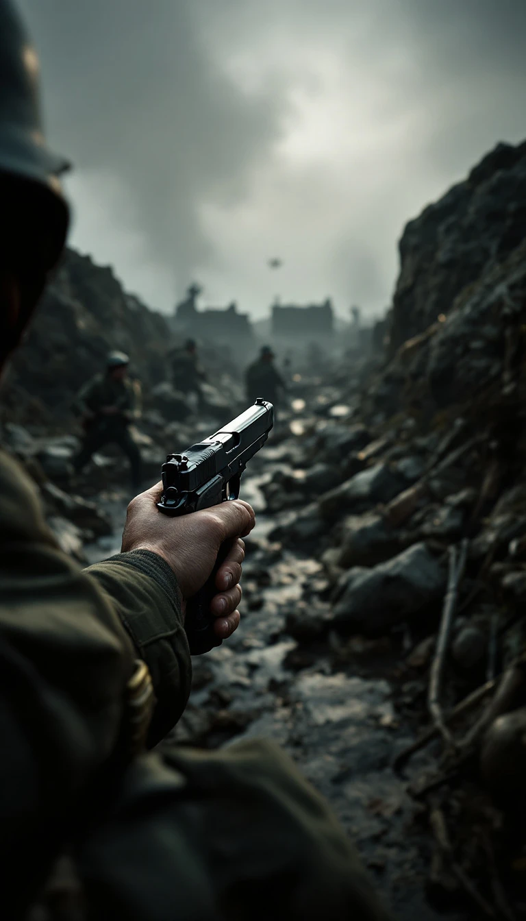 An ultra-realistic point of view (POV) image capturing the first-person perspective of a WWII soldier with his pistol on the battlefield. The character's hands and body parts are visible, creating a sense of immersion, as if the viewer were actually there. The scene is detailed, with cinematic lighting and an authentic atmosphere that transports the viewer to that time and place.