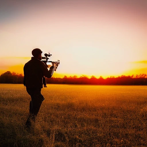 a hunter with a shotgun walks out of a field towards a muscle car at sunset