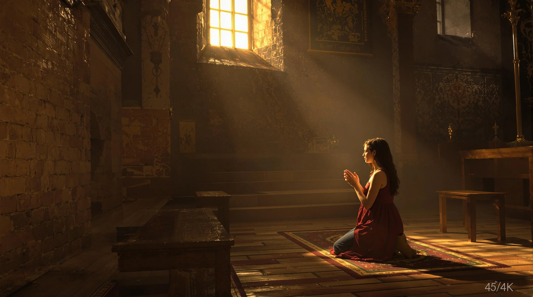 "Young woman praying on her knees in an old church, warm light coming through a window, expression of peace, digital art, realistic style, 4K"render, 8k