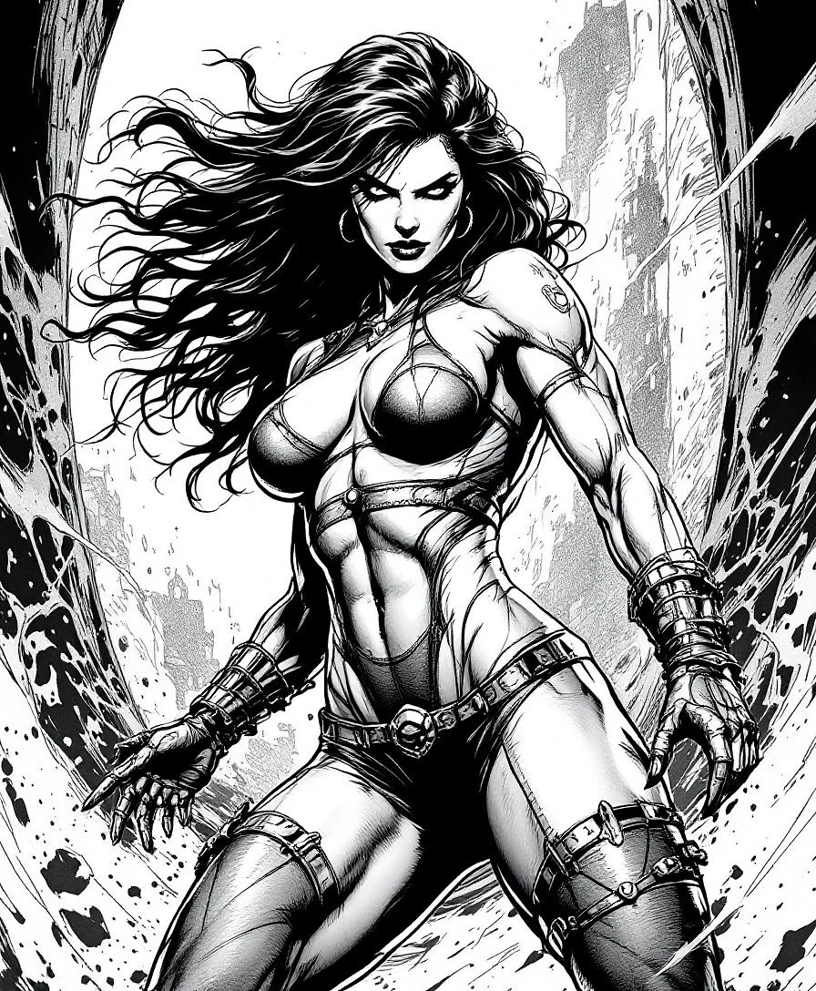 female in 90s Top Cow comic style, dynamic pose, inked line art, comic book illustration, detailed shadows, intense action, high contrast, intense lighting, detailed costume, best quality, highres, ultra-detailed, comic book, dynamic pose, physique, intense action, detailed costume, high contrast, 90s style, intense lighting, detailed shadows