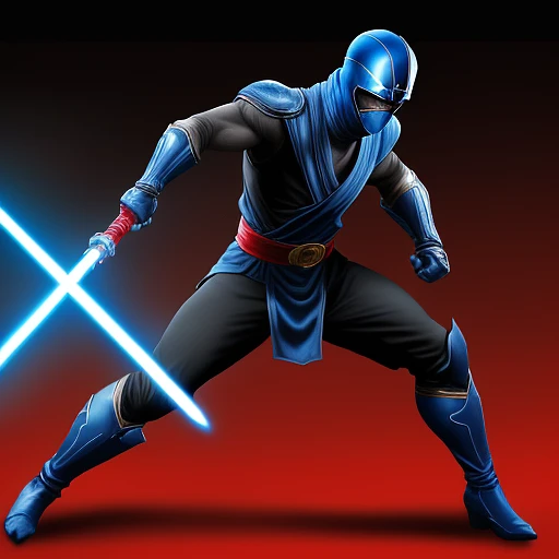 a tall black and blue ninja that looks like sub-zero with a sword and red belt, who is up against a a man in a RED SPANDEX SUIT, WITH GOLD GLOVES AND BOOTS , wearing a RED ranger helmet HOLDING a lightsaber