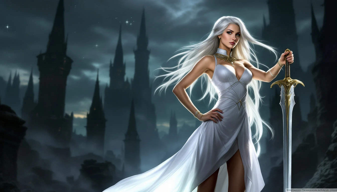 a woman in a white dress holding a sword, with a fantasy landscape in the background. The woman has long, flowing white hair and is wearing a white dress with gold accents and a high neckline. She is holding a large sword in her right hand, with the blade pointing downwards. The sword has a gold hilt and a long, curved blade. The woman is standing in a dramatic pose, with her left hand on her hip and her right hand holding the sword. The background of the image is a fantasy landscape, with tall spires and towers rising up into the sky. The sky is dark and cloudy, with a few stars visible. The overall effect of the image is one of drama and fantasy, with the woman in the white dress and the sword being the central focus of the image.