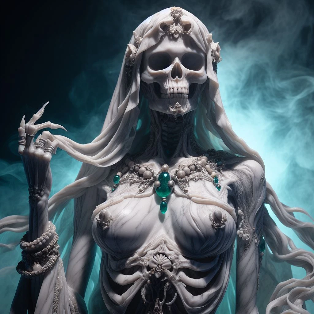 ultra detailed marble and jade sculpture of a female necromancer, skeleton face, volumetric fog, Hyperrealism, breathtaking, ultra realistic, ultra detailed, cyber background, cinematic lighting, highly detailed, breathtaking, photography, stunning environment, wide-angle