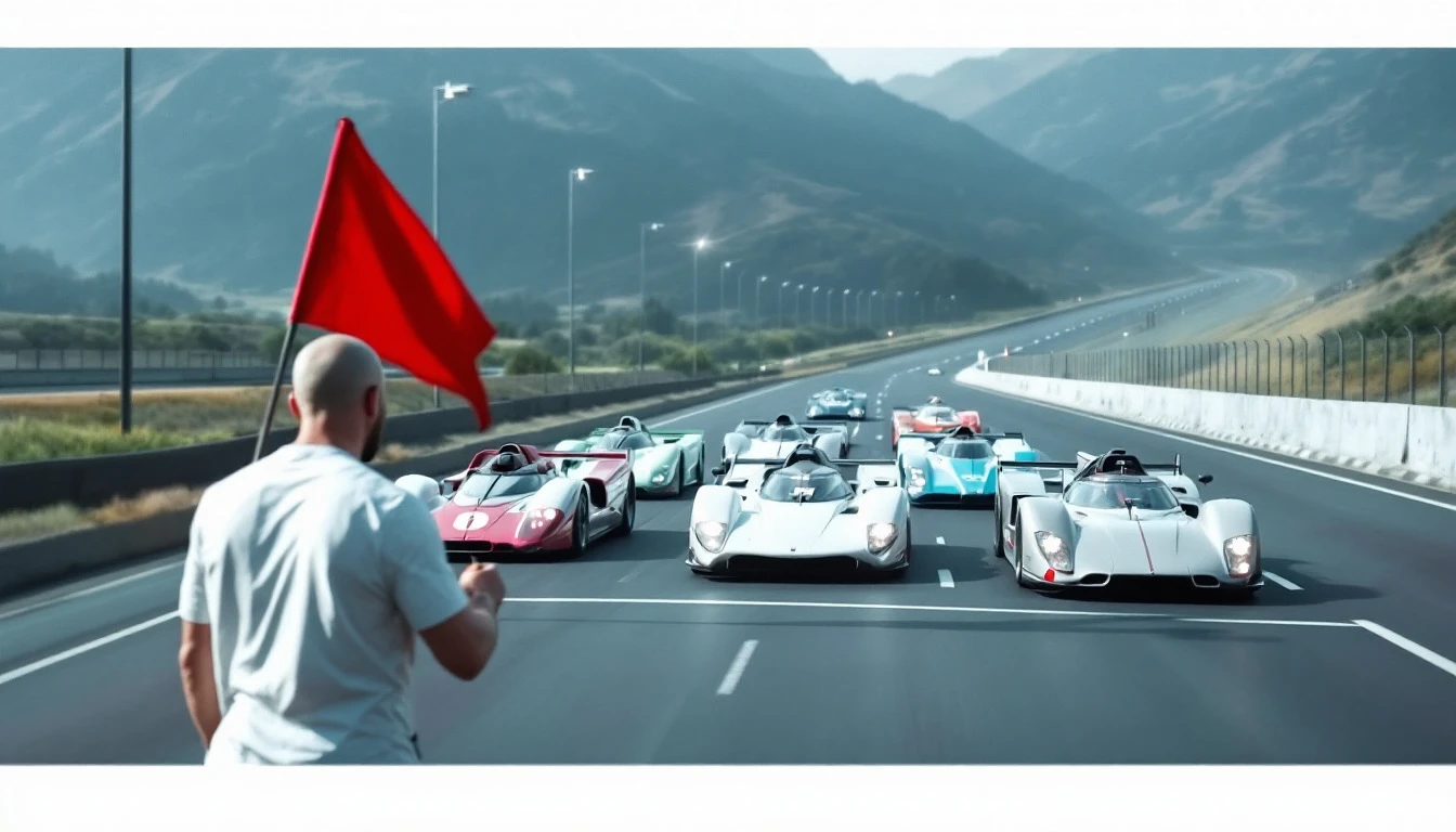 There are 6 racing cars at the starting line. On the side of the highway, behind the cars, there is a man in a white sports shirt, without a headdress, with a whistle and a red flag. A man whistles and waves a flag. The camera looks from the other side of the road, in front and slightly above, at 5 racing cars standing on the track at the starting line and at a man with a flag turned to face the camera and the cars. . Style - cyberpunk