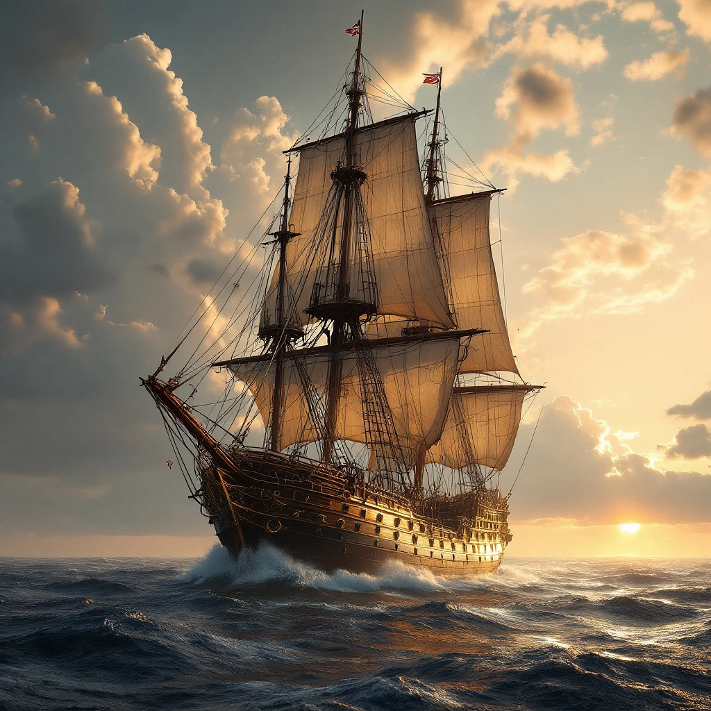 Photo of a ultra realistic sailing ship, dramatic light, pale sunrise, cinematic lighting, battered, low angle, trending on artstation, 4k, hyper realistic, focused, extreme details, unreal engine 5, cinematic, masterpiece, art by studio ghibli, intricate artwork by john william turner