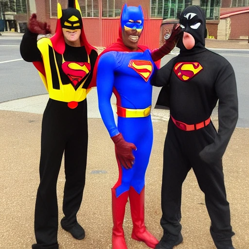 5 black man in different superhero costumes, one in a red and blue superman suit superhero, the other in a black batman suit, one in a green ninja suit, the other in a red bat suit and the member in a yellow ninja suit , al of which are wearing gold gloves and yellow boots, black sunglasses with a red ski mask and holding two spraycans in front of a black wall with graffiti with the word ZOZ that are engaged with five women, wearing black and pink cats suits seducing the superheroes