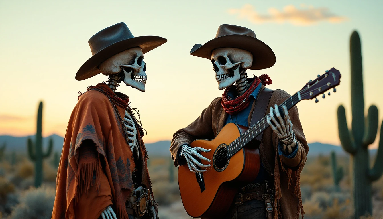 Estilo western, en el desierto al atardecer. Hay cactus. Two skeletons are talking to each other esqueletos. Both are wearing ponchos y sombreros de cowboy. Se ven en primer plano, close up. Un hombre con cara de calavera y una guitarra habla con los dos esqueletos. El hombre lleva un pañuelo rojo oscuro en el cuello, una chaqueta marrón y una camisa azul marino