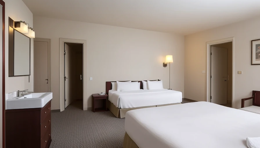 A well appointed hotel bedroom with a queen size bed. An open door leads to an ensuite bathroom.