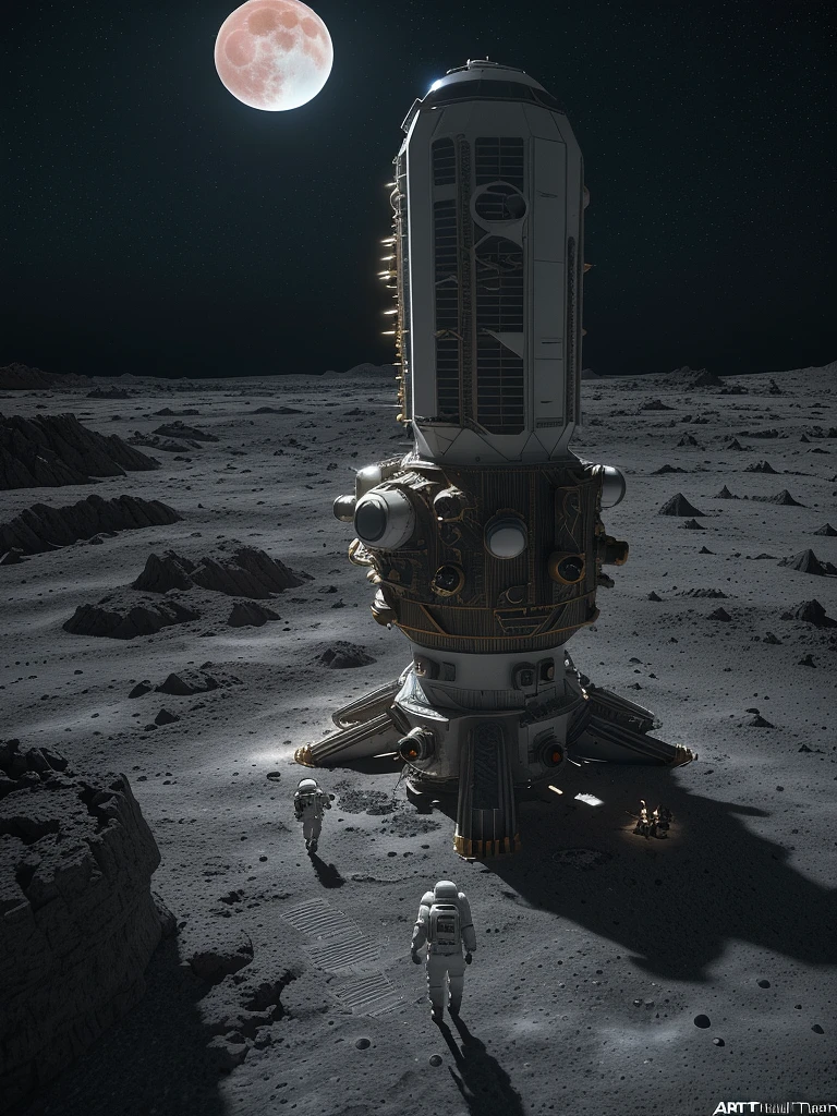 Photo of a ultra realistic moon expedition, bright light, cinematic lighting, battered, low angle, trending on artstation, 8k ultra HD, hyper realistic, focused, extreme details, unreal engine 5, cinematic, masterpiece, art by studio ghibli, intricate artwork by john william turner