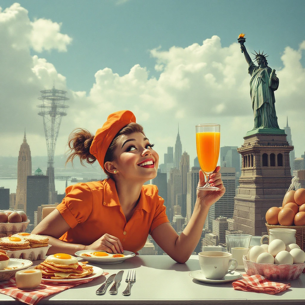 a dynamic and surreal retro 1970s-style album cover, featuring a chubby, joyful waitress zipping cheerfully across the scene, with a big friendly smile, dressed in a bright orange diner uniform, holding a glass of orange juice high like the Statue of Liberty's torch, breakfast plate in her other hand, the New York skyline creatively built from kitchenware and breakfast items (mugs, plates, cutlery, egg cartons) , soft airbrushed lighting, playful tone, slightly warped perspective like a vintage ad, with a touch of satire --ar 16:9 --v 5 --style raw