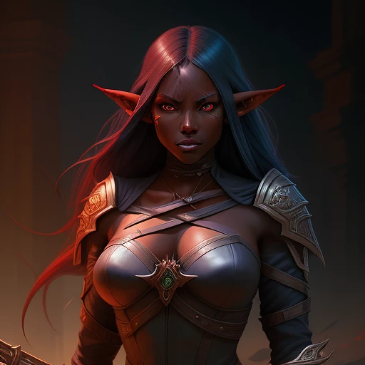 A photo of a female elf assassin, dark skin, red eyes, digital art, overdetailed art, by Dan Mumford, by Peter Mohrbacher, by Greg Rutkowski, fantasy character, detailed illustration, hdr, 4k, trending on artstation, best quality, highres