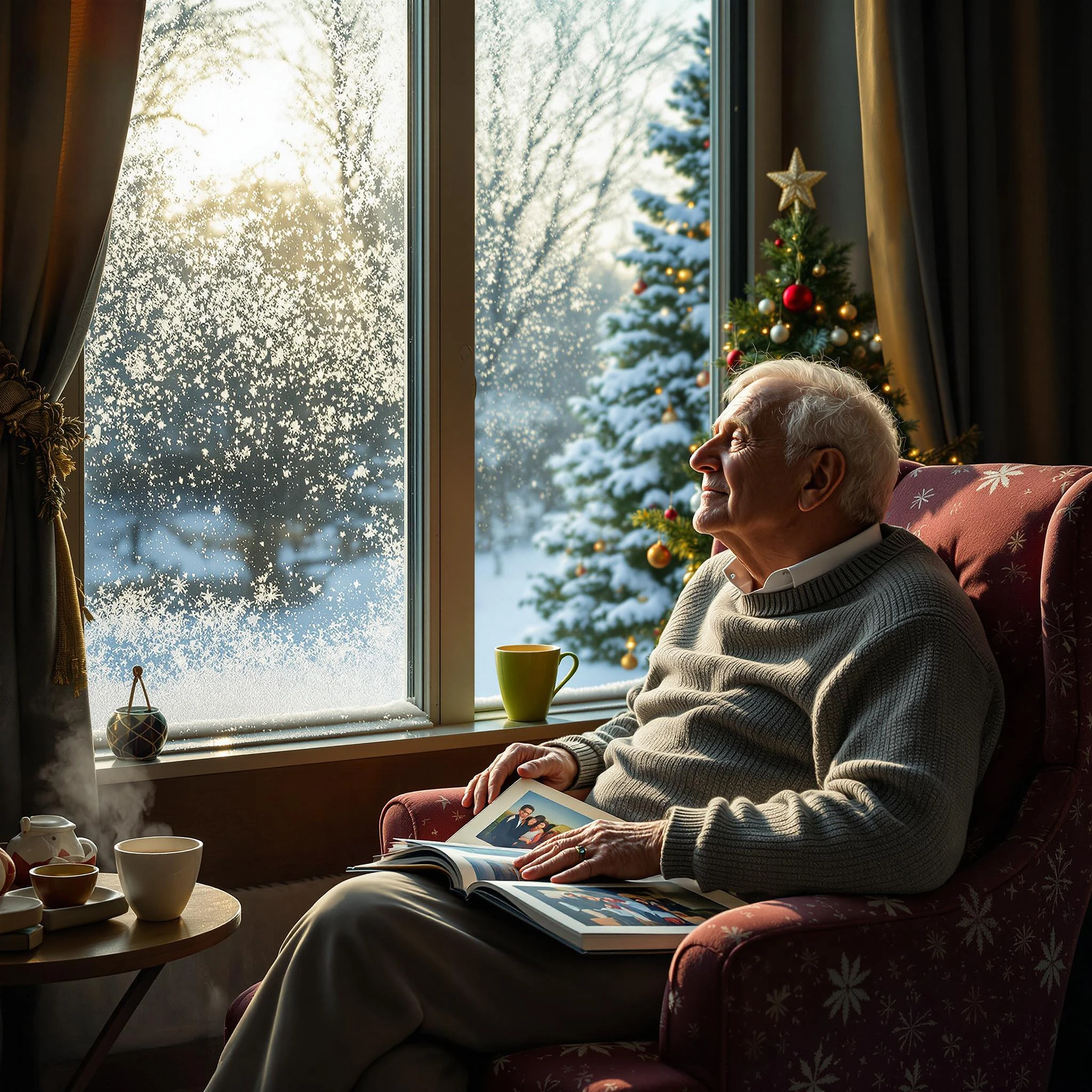 An elderly man sitting in a cozy armchair by a frosted window on a snowy morning, with a glowing Christmas tree in the background. A family photo album rests on his lap, and a steaming cup of coffee is on the table beside him. Sunlight streams through the window, casting a warm and peaceful glow across the room. The atmosphere is reflective, tranquil, and heartwarming.
