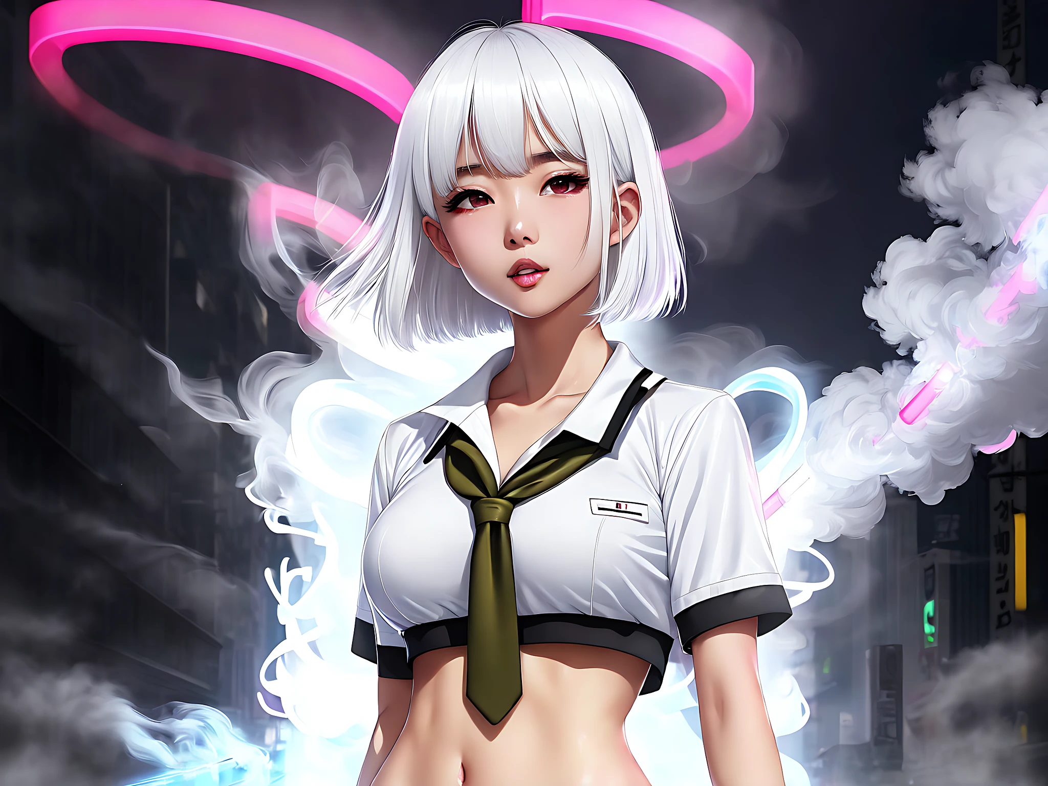 white hair, beautiful young asian girl, beautiful eyes, olive skin, medium length white hair, petite body, small breasts, toned body, wearing school girl uniform, showing midriff, perfect face, neon light smoke background, volumetric fog, Hyperrealism, cinematic lighting, highly detailed, breathtaking, 8k uhd