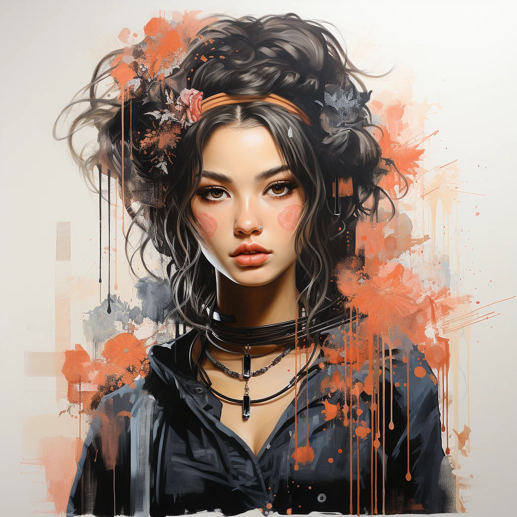Baroque- punk-type young — adult female character — design of the geisha in the style of risograph printed portraiture on artist’s paper, layered deep --s 750