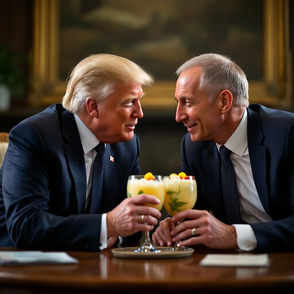 Donald Trump and Jens Stoltenberg in a loving meeting admiring each other while sipping on a pina colada