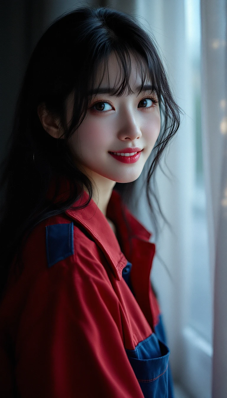Create a photograph of a beautiful korean woman (with gorgeous light-blue eyes staring at the viewer with a big smile. The photograph is taken from a slight angle. Her long black hair with bangs hangs over her shoulders. She is wearing a (red blue safety coverall for work:1.2) . She stands in front of a window covered in curtains in her bedroom late at night. very dark, casting shadow style, perfect eyes, extremely intricate details, masterpiece, epic, clear shadows and highlights, realistic, intense, enhanced contrast, highly detailed skin, f/2. 8, bokeh