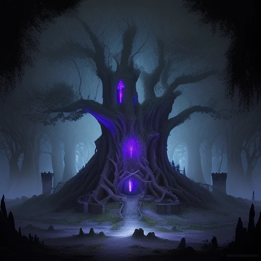 fortress of ancient trees, fortress inside the trees, majestic, dungeon synth, dungeon, fairytale, night. light, masterpiece, looks like it is not AI, booklet for music album, gothic
