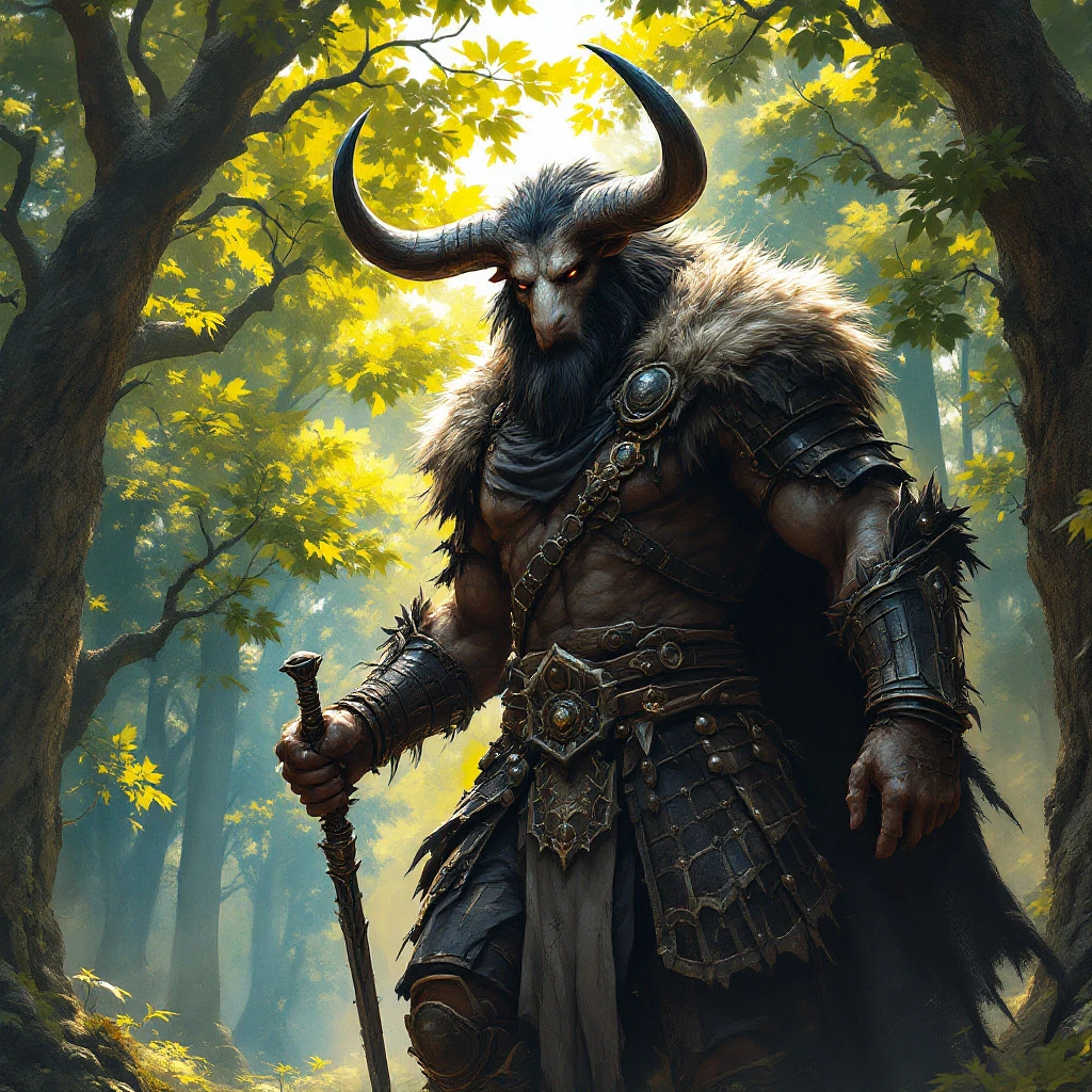 A minotaur warrior, his face with humanoid features, clad in battered black armor. His fur-lined cloak billows behind him as he walks imposingly. He wields a colossal beak as a weapon, which he holds in both hands. He highlights the details of his implacable expression to convey a sense of serenity. Trees stand tall where sunlight streams through the leaves.