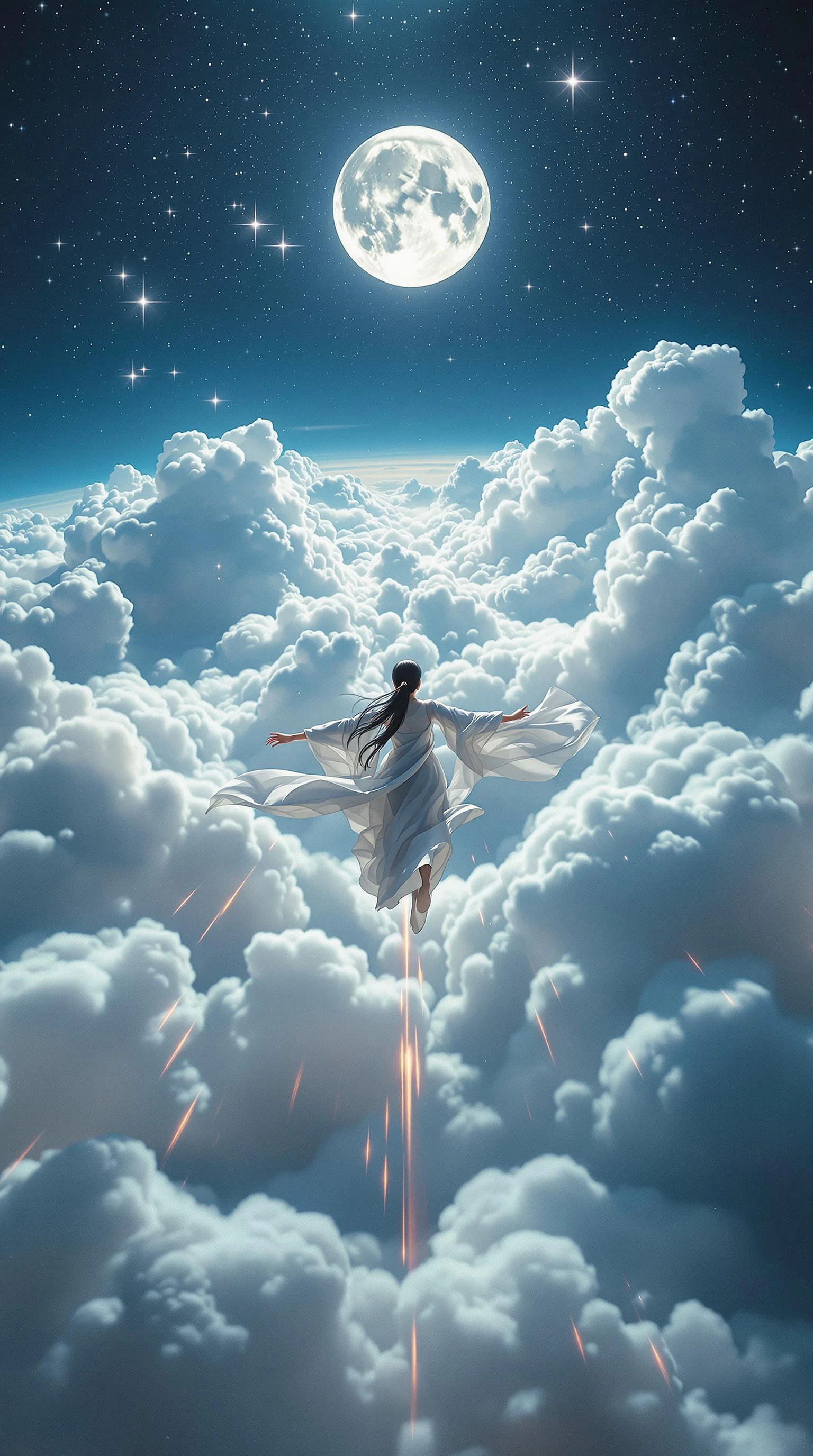 A rapid high-altitude tracking shot moves from a drone's perspective, capturing a surreal high-speed dream sequence of a beautiful ancient Chinese beauty flying forward in a prone position, effortlessly gliding between the clouds, her body fully extended, arms outstretched to the sides, legs slightly apart, and head forward, capturing the sensation of smooth horizontal flight. Her clothes flutter in the wind, and the camera closely tracks from a slightly higher vantage point, moving from left rear to right rear, maintaining a continuous view of the prone posture as the character swiftly traverses the scene. The environment is dynamic, with rapid changes, featuring clouds below, white clouds continuously sweeping backwards, a large moon hanging high in the distance, and a sparkling starry sky all around, with motion blur and light trails enhancing the sense of speed and fluidity. Fast movement.
