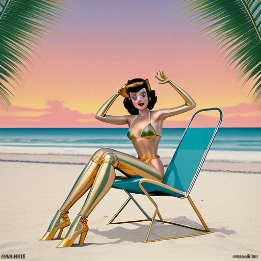 80s chrome and steel Retro Sunset, golgen hot robot girl in bikini, sitting on beach chair, legs up in the air like a 50s pinup girl, 80s esthetics, water, gold, illustration, inspired by James Jean 80s chtome and steel Retro Sunset, beach and palms scene, green, gold, illustration, inspired by James Jean, variation